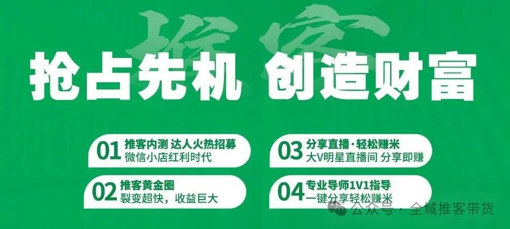 微信小店与推客系统的结合,既是推客私域流量为小店商家降本增效的利器,也是普通人逆袭的巨大机遇。政策红利窗口期短暂,2025年是推客元年也是关键的一年。早一步布局,早一步获得社交电商的万亿蓝海!