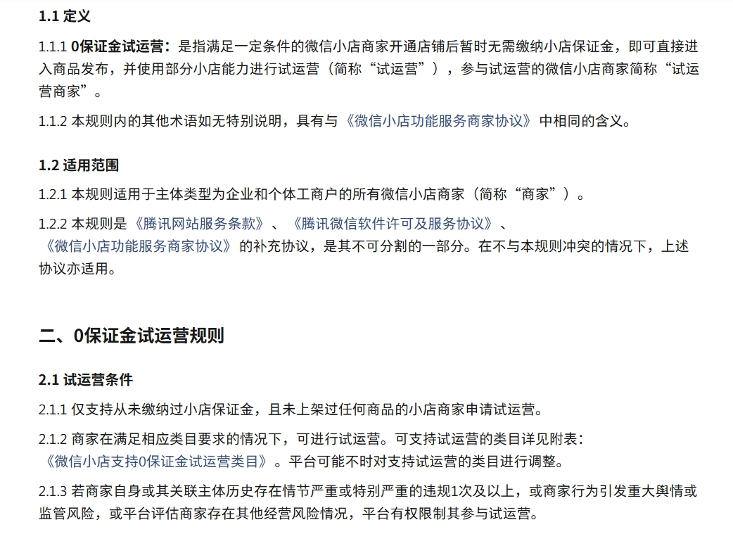 0保证金试运营政策:微信小店为品牌商家提供了“0保证金”试运营政策,涵盖了日常百货、生鲜等多个类目。企业只需出示营业执照,就能迅速开设店铺,从而大大减轻商家的资金压力。
