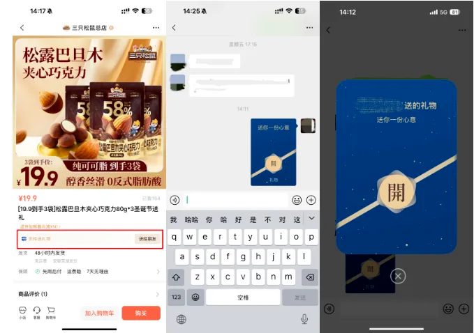 微信小店的“送礼物”这一功能已经成为了爆点:用户可以匿名赠送礼物,收到礼物不喜欢还可以换,退货的几率非常低!商家利用这一功能来吸引新客户效率可以有效提升50%甚至更多。此“送礼物”功能,有助于小店商家提高品牌曝光和私域流量运营效果,特别是在各种节日,如圣诞节、元旦、春节、情人节等节日期间。在节日的推动下,社交与电商的结合将更加紧密,进而帮助商家提升销售额、复购率及转化率。而且,“送礼物”功能在好友聊天窗口的“+”里面,该功能排在“红包”之后,入口十分明显。可见此功能的重要程度!